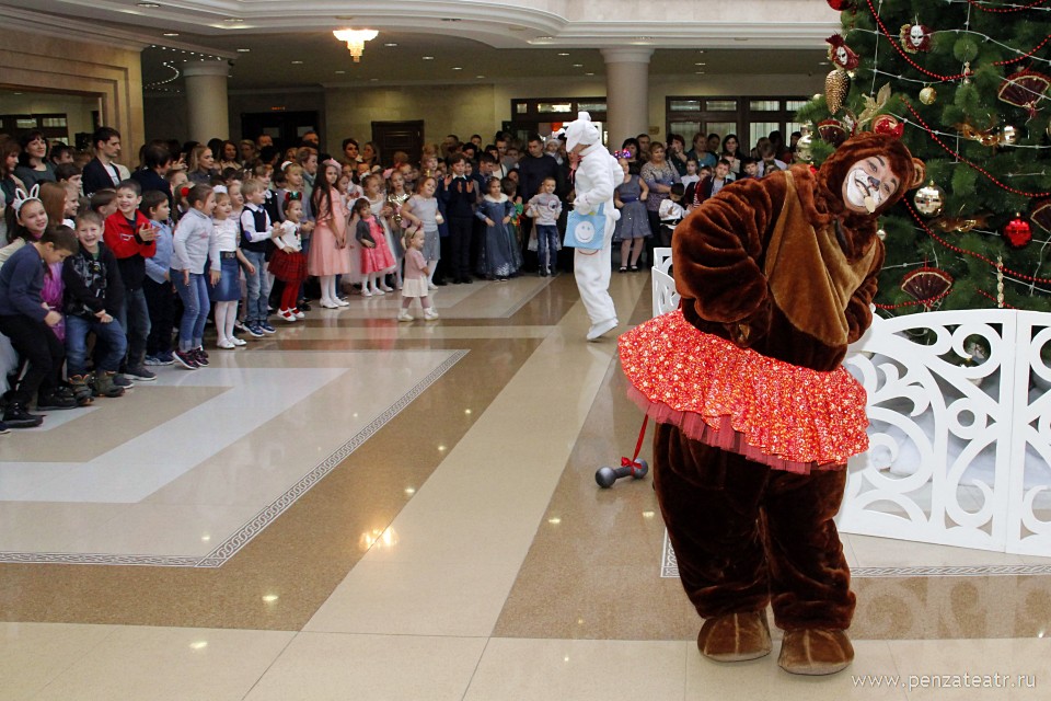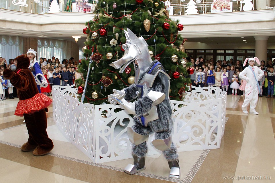 Хотя, наверное, начать нужно не с этого. Утром 21 декабря большое фойе Пензенского драматического театра наполнилось детскими голосами — сотни юных зрителей, от совсем крох на руках у мам и пап до вполне уже самостоятельных школьников, пришли на первое новогоднее представление. Теперь почти ежедневно, по три раза в день, у зеленой красавицы-елки с детьми будут играть, петь и танцевать веселый Дед Мороз (ростом и голосом слегка напоминающий актера Николая Шаповалова) и его очаровательная внучка Снегурочка (очень похожая почему-то на актрису Анну Арзямову). Вместе с ними к ребятам придут помощники Деда Мороза — Зайка-всезнайка (чем-то смахивающий на Юлию Кузнецову), Медведица-спортсменка (внешне отчасти сходная с Марией Соловьевой), а еще совершенно неожиданный персонаж: Волк, который так заигрался в компьютерные игры, что сам стал... трансформером (спойлер: благодаря чтению книг и занятиям спортом ему удастся снова стать нормальным и совсем не злым серым зверем; кстати, в нем при желании можно найти сходство с Ильей Кочетковым).
